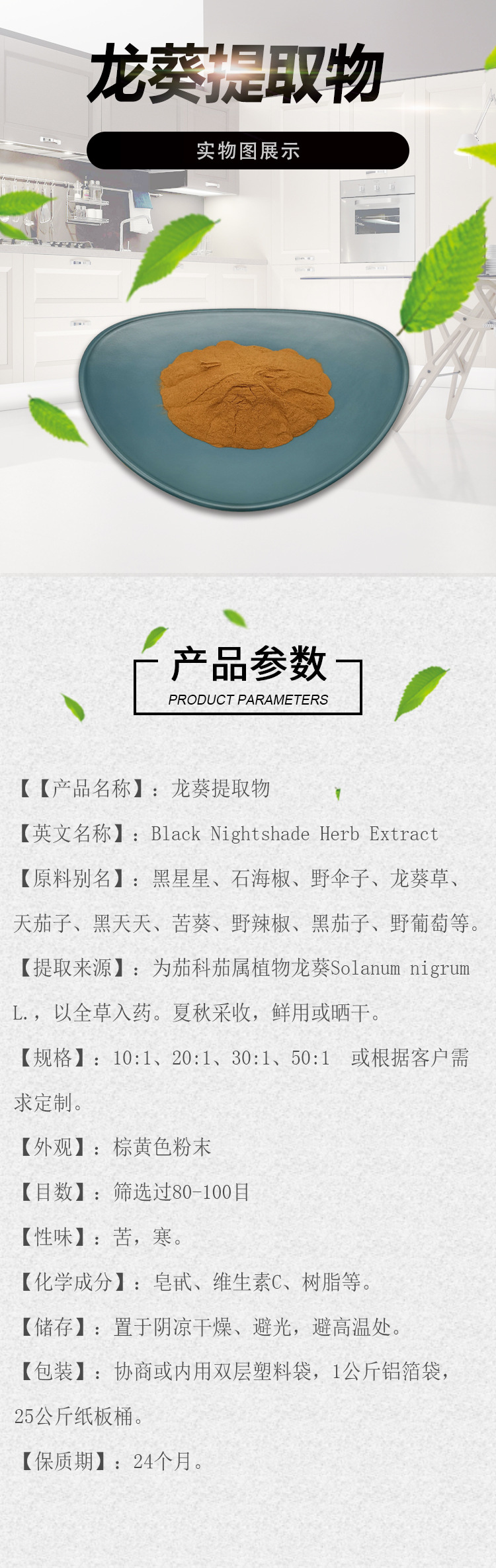 | 主要成分 | 含龙葵碱(solanigrine)、澳茄胺(solasodine)、龙葵定碱(solanigridine)、皂苷、维生索C、树脂。 |