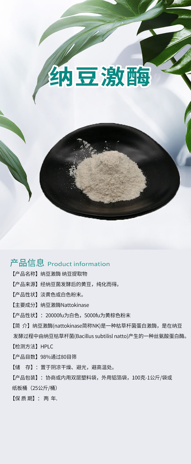 产品简介:纳豆激酶 (nattokinase简称NK)是一种枯草杆菌蛋白激酶,是在纳豆发酵过程中由纳豆枯草杆菌(Bacillus subtilisl natto)产生的一种丝氨酸蛋白酶。